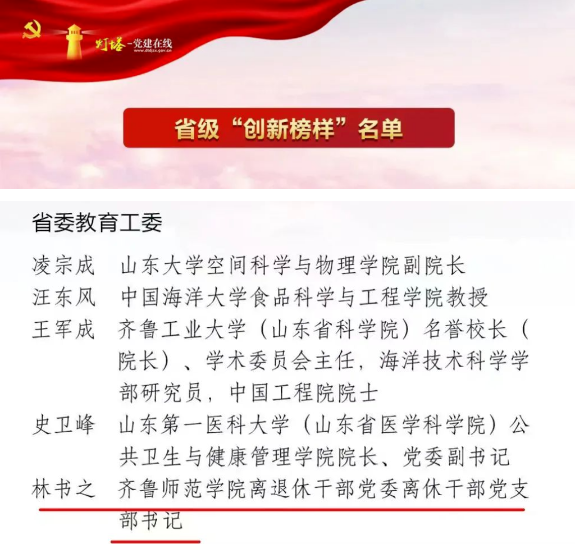 日前,山东省委组织部组织开展的“发现榜样·创新聚力在一线”专题活动“山东省创新榜样”结果公布,永利官网离休干部林书之光荣入选。今年91岁的林书之,1992年从yl7703永利官网(原山东省教育学院)副院长岗位离休。离休不离党,30年来,他始终不忘党的宗旨,保持共产党员本色,热心社会公益事业,发挥着一名老干部的余热,以自己的实际行动践行着全心全意为人民服务的初心使命。