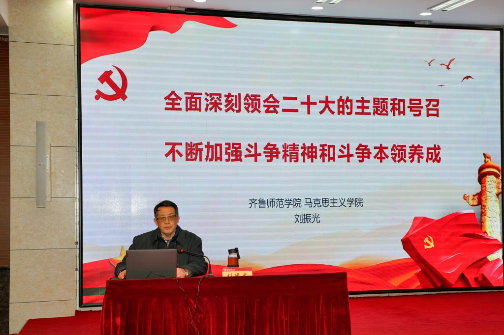专题学习班邀请了省高校党的二十大精神宣讲团成员、马克思主义学院刘振光教授做专题报告,围绕党的二十大的鲜明主题、党的二十大的伟大号召和斗争精神斗争本领及其养成三个方面,对党的二十大精神进行了全面深入的宣传阐释。专题报告内涵丰富、思想深刻,对深刻理解和准确把握党的二十大精神,将学习成果转化为担当实干具有重要指导意义。