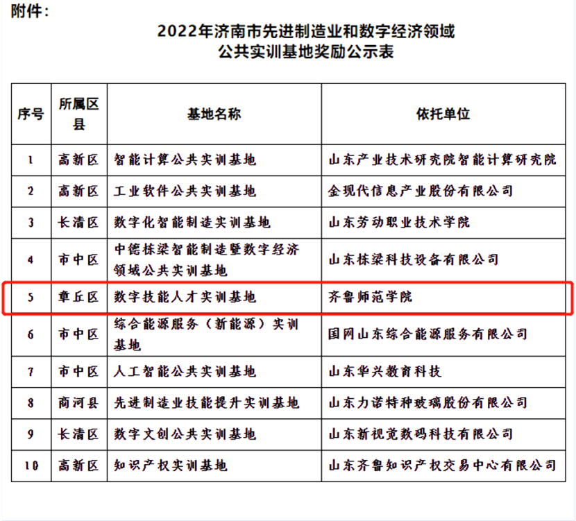 附:2022年济南市先进制造业和数字经济领域公共实训基地奖励公示表