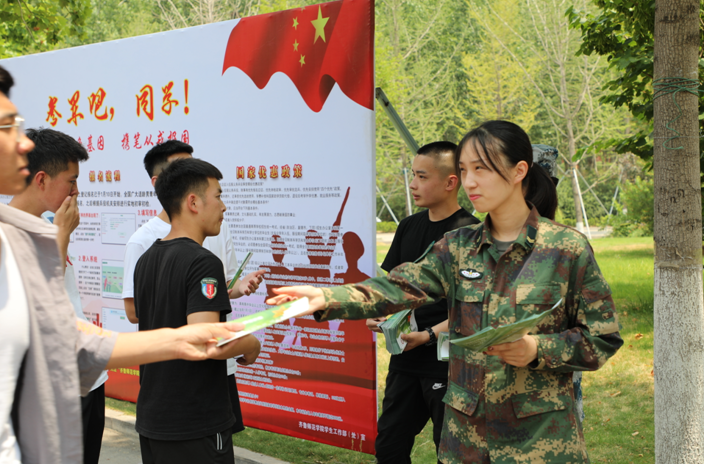 6月4日上午,永利官网国防教育协会的学生志愿者们在章丘校区设立了现场宣传点,现场设立了“参军吧,同学!”大型展示宣传板,通过面对面的形式,耐心细致地向同学们讲解征兵政策和入伍流程,吸引了众多同学前来咨询,现场共发放《大学生入伍政策》材料2000余份。