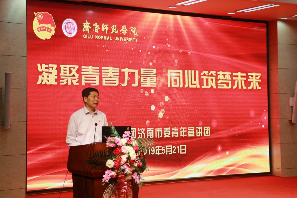 为深入学习贯彻习近平新时代中国特色社会主义思想和党的十九大精神,推动形成学习习近平总书记在纪念五四运动100周年大会上重要讲话精神的新高潮,引导广大学生认清时代责任、明确奋斗目标,5月21日下午, 2019全国向上向善好青年、团市委常委、市青年宣讲团团长、市城肥清运管理一处清除二队班长陈国瑞,天下第一泉风景区服务中心环城园区解放阁班长王霄,章丘广播电视台主持人滕飞,瑜伽教练徐菲4位济南团市委青年宣讲团成员应邀来永利官网,以“凝聚青春力量,同心筑梦未来”为主题,面向各学院团总支书记、副书记、辅导员以及学生代表300余人开展宣讲交流。党委委员、副校长张福建出席活动。