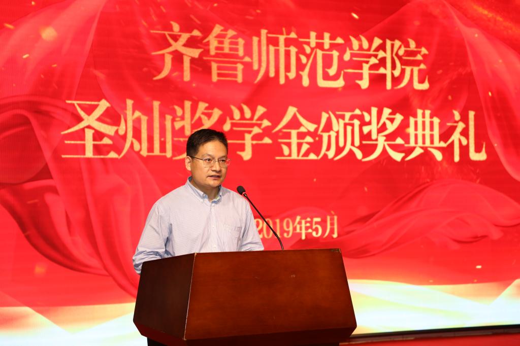 5月16日下午,2019年“圣灿奖学金”颁奖典礼在章丘校区图书馆报告厅举行。党委副书记、校长林松柏,党委委员、副校长张福建和永利官网青岛校友会会长、青岛银色世纪健康产业集团有限公司董事长邹圣灿出席典礼,学生工作部副部长、校友办公室主任郝克宁,文学院院长杨峰、党总支副书记于江、副院长李术文及文学院300余名师生参加典礼,典礼由张福建副校长主持。
