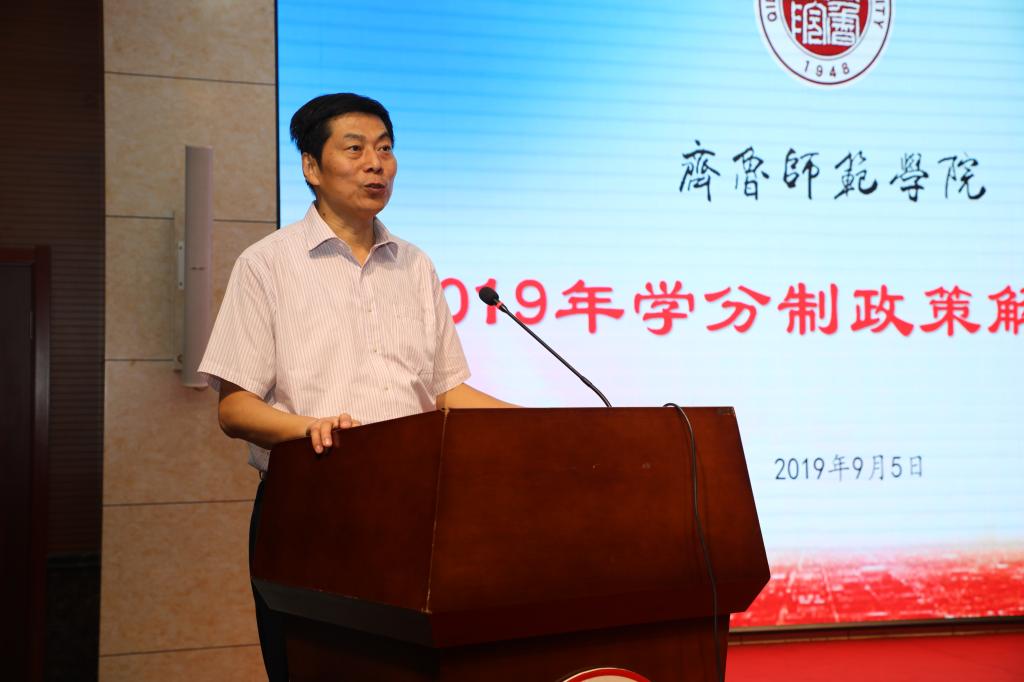 教务处处长梁承锋详细讲解学分制教学管理规范,阐述实行学分制给教学管理、授课、收费带来的变化,以及学生选课与学生缴费的关系等。