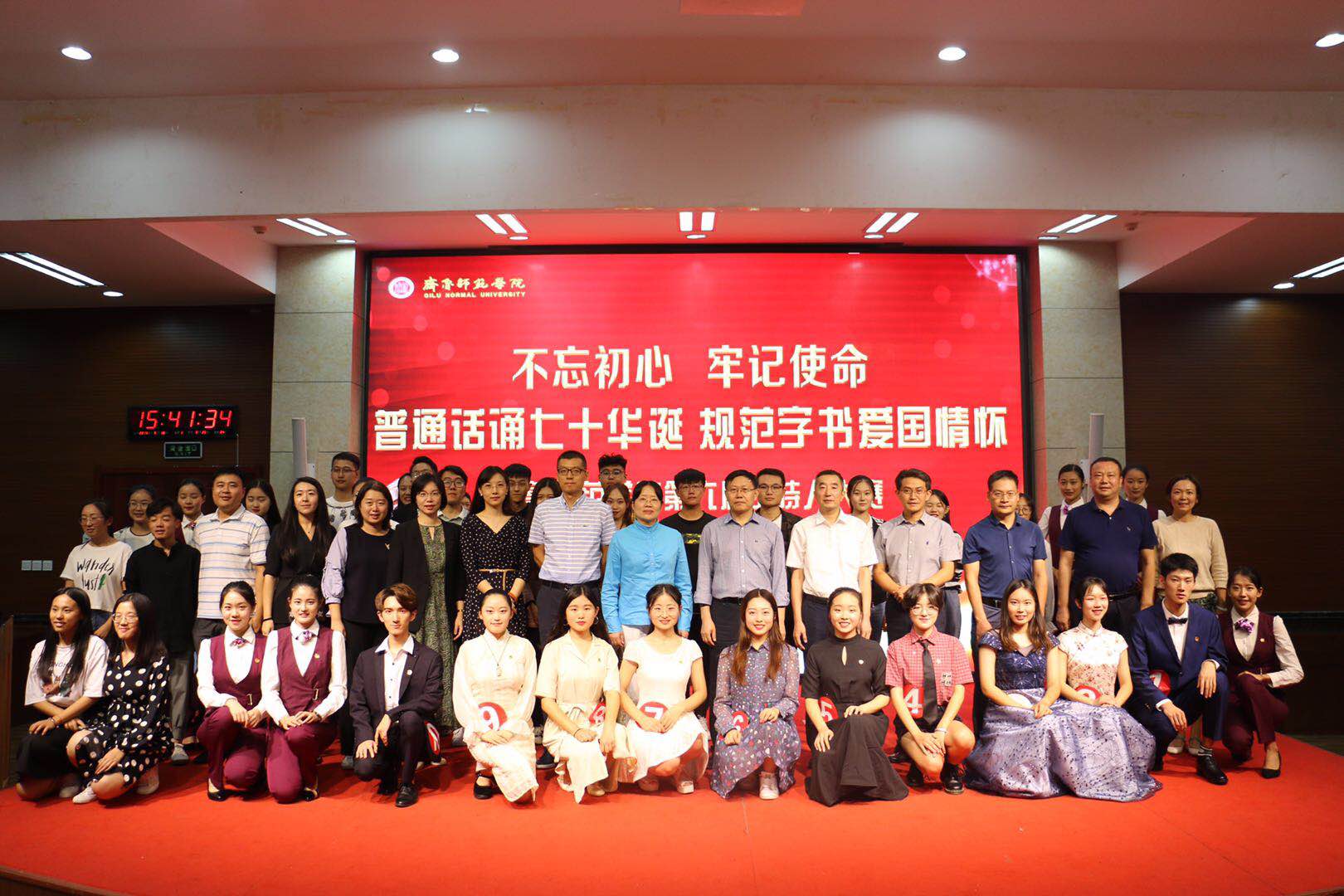为丰富校园文化生活,充分发挥学校在普及普通话和规范汉字中的基础作用,提升语言文字规范化工作水平,构建多彩“第二课堂”体系。9月18日下午13:30,由教务处主办,团委承办的“不忘初心、牢记使命”普通话推广活动暨第六届主持人大赛决赛在永利官网章丘校区学术报告厅隆重举行。