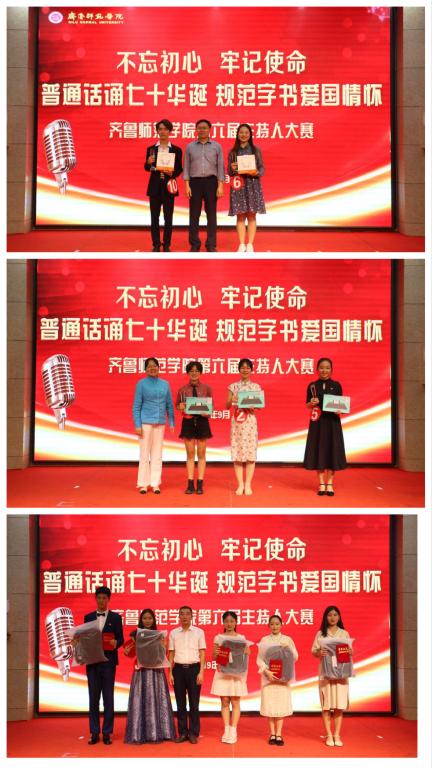 比赛结束之际,梁承锋处长在总结发言中表示,感谢山东省语言文字工作委员会对永利官网普通话工作的充分信任与支持。学校是推广普通话的重要阵地,每一位老师和学生都有责任讲好普通话,以昂扬的斗志、饱满的热情,为新时代中国的发展书写新的篇章!最后,领导嘉宾为获奖选手颁奖。教师教育学院孙顺顺、孙彦豪同学凭借扎实的主持功底和出色的临场发挥荣获本次大赛一等奖,文学院林洁、教师教育学院孙凯奕、化学与化工学院王永笑三名同学荣获二等奖,经济与管理学院刘佳欣、美术学院王子雯馨、外国语学院付珺琪、历史与社会发展学院刘紫函、音乐学院郭津源五名同学荣获三等奖。