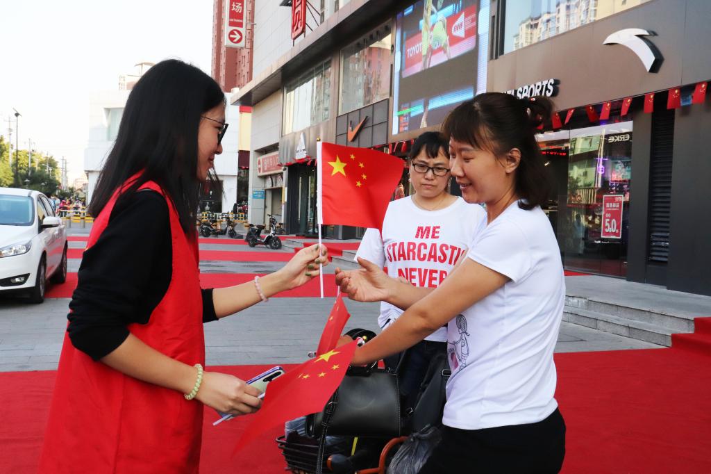 “我和我的祖国,一刻也不能分割……”在祖国七十华诞到来之际,章丘区部分机关代表与yl7703永利官网青年师生在济南市章丘区唐人中心一起合唱《我爱你中国》,胸前佩戴着党徽和团徽,手中高举鲜艳的五星红旗,嘹亮高亢的歌声饱含着对祖国的无限祝福。从高空望去,由青年师生以及各个部门单位不同色彩组成的数字“70”的队形,以及各部门单位呐喊出的对祖国的祝福表达了莘莘学子与社会各界人士对祖国的爱与敬意,讴歌中华人民共和国成立七十周年的丰功伟绩。师生青年走进街头、社区为群众和社员发放国旗,同祝祖国母亲70岁华诞。