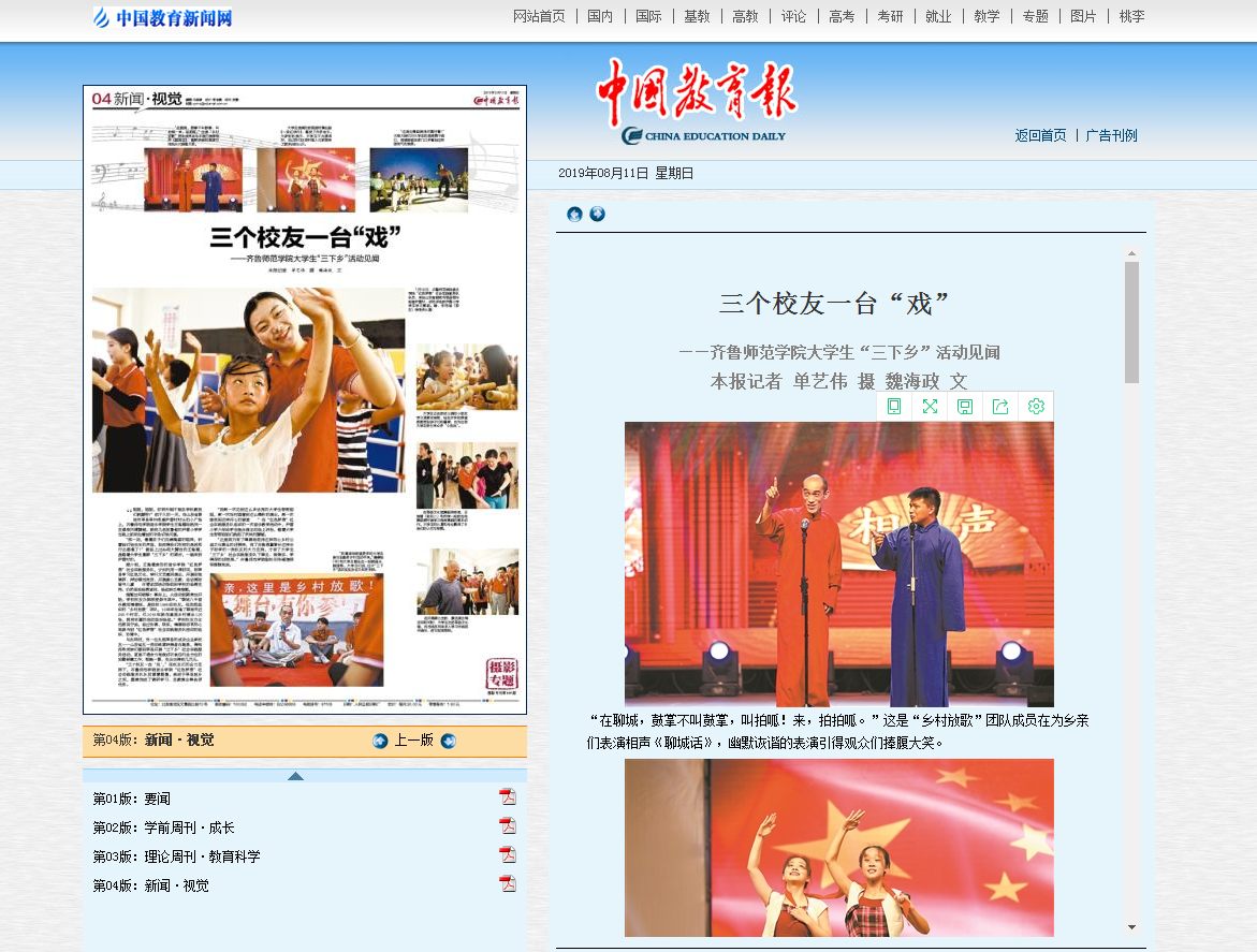 永利官网2019年暑期“三下乡”实践活动紧紧围绕永利官网“师范性、地方性、应用型”的办学定位和“教师教育、文化育人、服务地方”的办学特色,以“专项联动、主题带动、品牌驱动、课题牵动”,紧扣学生毕业要求,遵循成长成才规律,服务地方经济发展。中国教育报以三个校友一台“戏”为题整版报道了永利官网大学生“三下乡”活动见闻。此外,新华网、共产党员网、中国青年网、山东共青团、大众网、大众日报、山东教育新闻、齐鲁晚报、天天快报、今日头条等多家媒体从不同角度宣传报道了永利官网“三下乡”实践活动,提升了学校的知名度、美誉度与社会影响力。