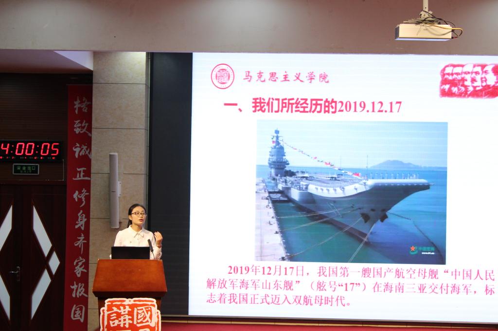 赵欣副教授在辅讲中从“为什么要发展航母”、“我国航母发展历程”、“我国海军和航母发展迅速的原因”、“我国航母与其他国家航母比较”和“我国航母发展展望”四个角度层层展开,观点鲜明,逻辑清晰,彰显着对我国强盛的国力、“集中力量办大事”的社会主义制度优势和强大的工业制造能力的高度自信。李倩同学带大家回顾了中国为实现航母从改建到自建的历史性跨越所经历的风雨历程,结合自身感悟赞扬了作为新时代青年敢为、敢做、敢担当的精神品质,展望了航母梦、海洋梦、中国梦的美好蓝图,充分彰显了新时代青年自强不息、奋发有为的向上风貌。