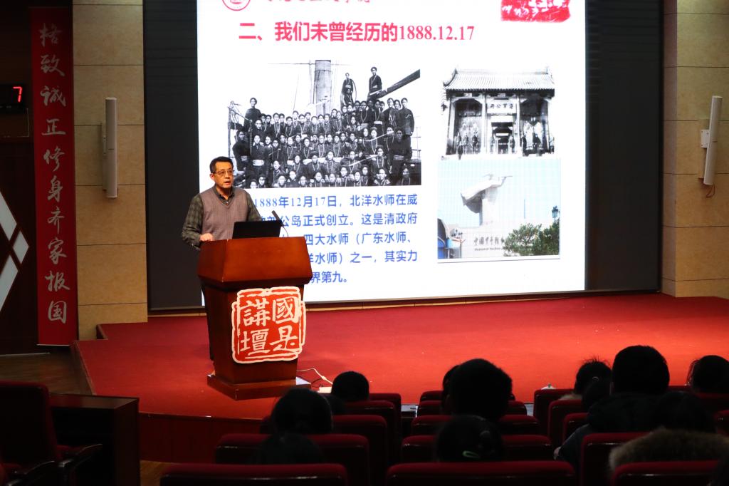 1月2日下午,值我国第一艘国产航母“山东舰”入列不久,为适时对永利官网学生进行思想政治教育,由永利官网宣传部、团委主办,马克思主义学院及学院学生社团“星火学社”承办的“国是讲坛”第45讲——“你记着你所经历的2019年12日17日,我告诉你不曾经历的1888年12月17日”特别活动在章丘校区学术报告厅隆重开讲。此次讲座由马克思主义学院院长刘振光教授主讲,马克思主义学院“概论”课教研室主任赵欣副教授和yl7703永利官网第十届校学生会副主席、马克思主义学院2016级本科生李倩同学担任辅讲。校青年马克思主义者培养工程学员、各班级团支部书记及学生代表近400人到场聆听。