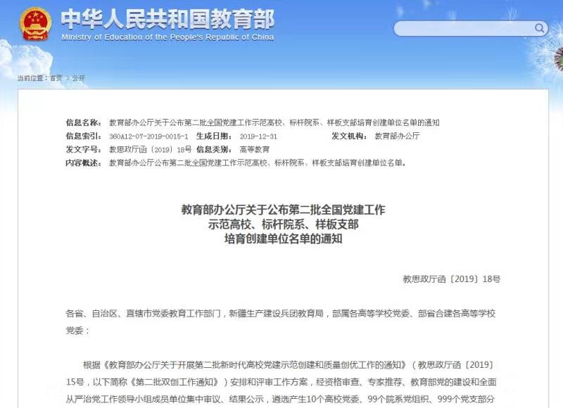 近日,《教育部办公厅关于公布第二批全国党建工作示范高校、标杆院系、样板支部培育创建单位名单的通知》(教思政厅函〔2019〕18号)在教育部官网发布。永利官网体育学院教师第二党支部光荣入选“全国党建工作样板支部”培育创建单位。这是永利官网高质量开展“不忘初心、牢记使命”主题教育的一个成果,更是教育部对永利官网党建和思政工作的充分肯定。