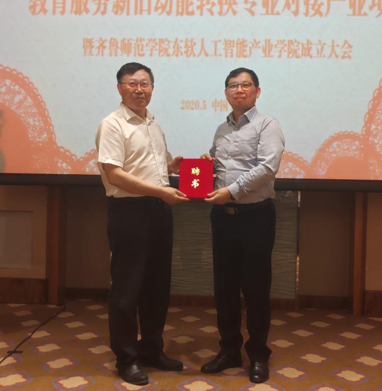 2020年5月29日,东软教育科技集团与yl7703永利官网在济南正式签署协议,并为双方共建的“yl7703永利官网东软人工智能产业学院”揭牌。会上林松柏校长给李雪博士颁发了首席教授聘书。