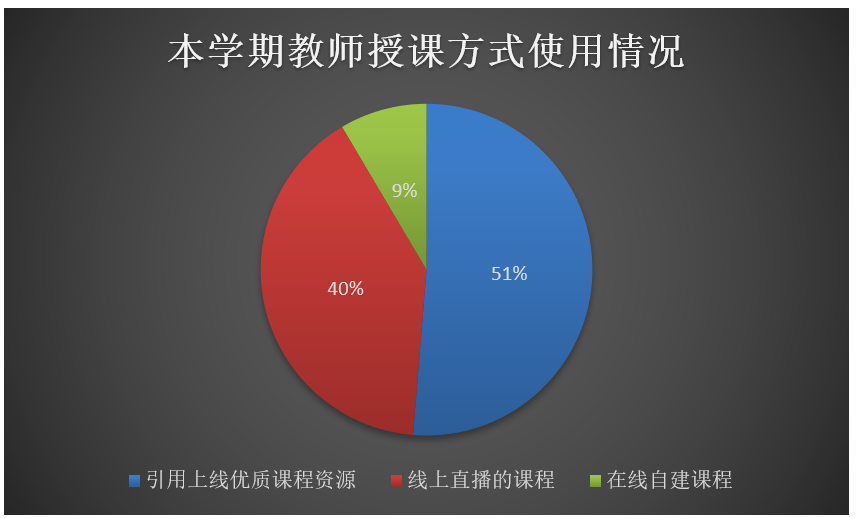 在特殊时期,永利官网教师用实际行动展现出人民教师在疫情面前的担当,践行着人民教师立德树人、铸魂育人的时代使命。教师们积极探索,根据学科特点、课程要求,平台已有优质资源等情况自主选择合适自己的方式开展混合式教学。在线教学方式主要基于引用已上线优质课程资源占51.3%,基于线上直播的课程占40.2%,基于在线自建课程占8.5%。