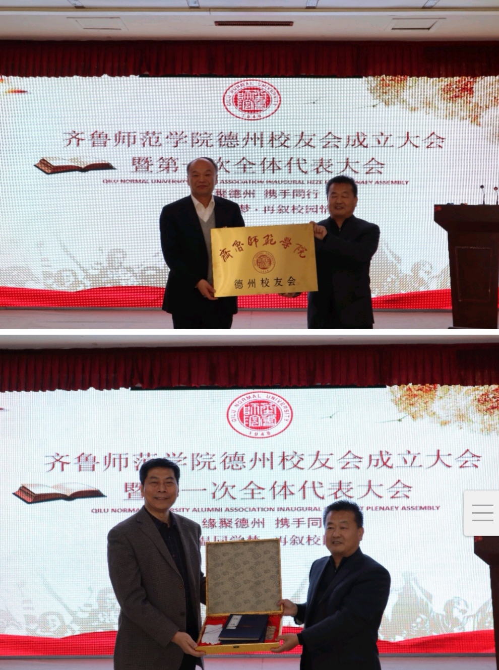 王玉华为yl7703永利官网德州校友会授牌,张福建代表学校与德州校友会互赠礼物,无论校友与母校相距多远,校友与母校之间的情谊永存。