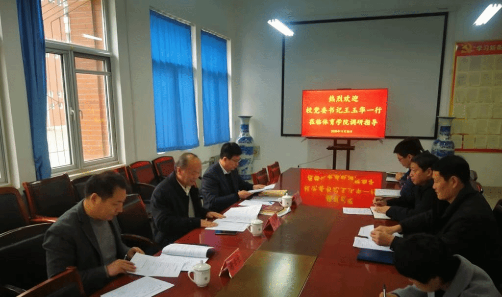 王玉华在听取工作汇报之后,对体育学院的整体工作开展情况给予了充分肯定。他指出,体育学院党总支会议、党政联席会议制度执行到位;切实把立德树人作为根本任务,先后推出了一系列先进学生典型事迹,在全校学生中发挥了很好的引领作用;学风建设卓有成效,考研录取率达到30%,学习风气日渐浓厚;签订《师德师风承诺书》的成功做法值得长期坚持。