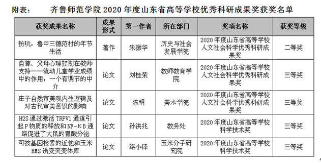 历史与社会发展学院朱振华副教授撰写的著作《扮玩:鲁中三德范村的年节生活》获人文社科类二等奖;教师教育学院刘桂荣副教授的论文《自尊、父母心理控制在教师支持——流动儿童学业成绩中的作用:一个有调节的中介》、美术学院陈明副教授的论文《庄子自然审美观内生逻辑及对古代审美意识的影响》均获人文社科类三等奖;教务处孙洪兆教授的论文《H2S通过激活TRPV1通道引起P物质的释放和NF-κB通路促进了大鼠的胃酸分泌》和玉米分子研究院路小铎教授的论文《可按基因检索的近饱和玉米EMS诱变突变体库》均获科学技术类三等奖。
