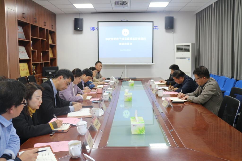 为加强学校党委对基层党组织工作的分类指导,密切校党委委员与党支部之间的工作联系,进一步落实党建工作责任制,全面提高基层党建工作整体水平,10月25日下午,学校党委副书记、校长秦梦华到化学与化工学院调研指导工作。人事处处长刘增军、教务处副处长李剑陪同调研,化学与化工学院党政班子成员、各党支部书记、实验中心主任、教授代表参加座谈会。座谈会由化学与化工学院党委书记郭百灵主持。