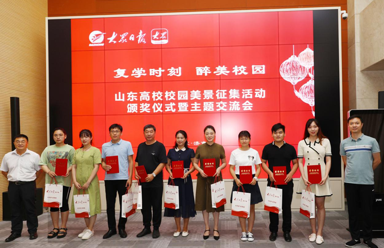 作为获奖代表,张淑芬老师还受邀参加了“复学时刻·醉美校园”山东高校校园美景征集活动颁奖典礼暨主题交流会。她与获奖代表们共同观看了大众报业集团融媒体中心宣传片,初步了解大众报业集团在媒体融合转型方面的新思路和新亮点。山东大众报业(集团)发行有限公司董事长兼总经理郭利民和大众日报新媒体采编运营中心主任兰传斌共同为获奖师生代表颁发荣誉证书和纪念品。