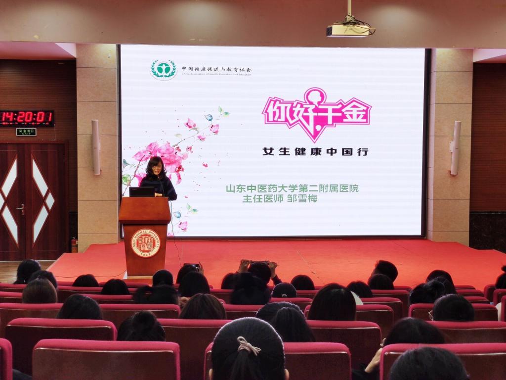 本次大讲堂活动邀请了山东中医药大学第二附属医院妇产科主任邹雪梅主任作为主讲人。邹主任以“女性的一生”作为话题导入,结合具体图片,细致地讲解了女性生理的特点及生殖的过程,接着以艾滋病为例,介绍了女性常见的妇科疾病及症状,最后劝导在场的女生们要保护好自己,提出了相关的预防措施和健康的生活方式。现场座无虚席,气氛热烈,在讲座后的健康互动问答环节中同学们积极提问,兴趣高涨,邹主任认真倾听,耐心解答,用专业的知识帮助女生们解决困惑。中国健康促进与教育协会代表还向永利官网授予了“你好千金一女生健康中国行”教育基地牌。