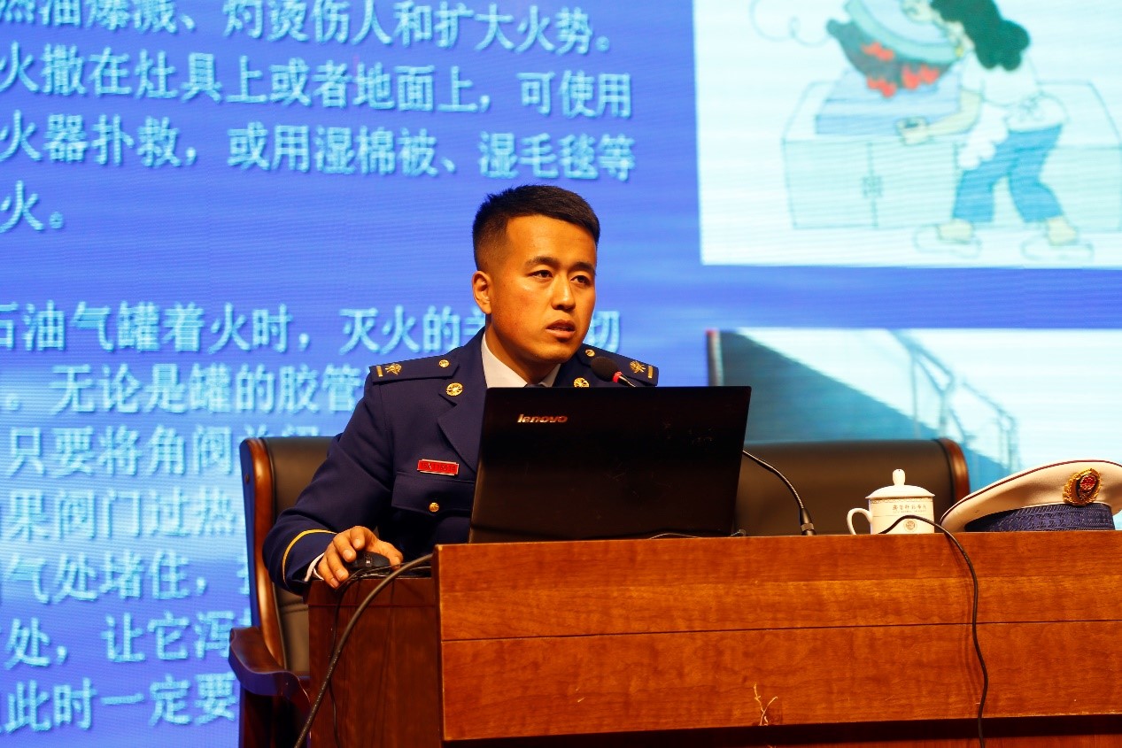 接着,任参谋结合大量生动案例,详细讲解了防灾防震、安全疏散、紧急避险、紧急逃生自救等消防安全常识,重点强调了用水、用电、用气等消防安全常识,具体介绍了毛巾捂口鼻、棉被裹身、毛毯隔火、匍匐前进、绳索自救、被单拧结、跳楼求生、攀爬避火法、卫生间避难等火场逃生自救技巧。