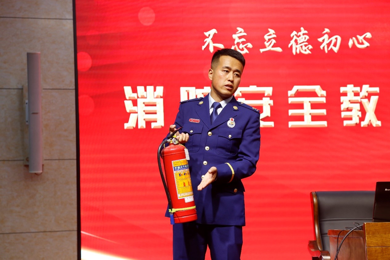 最后,任参谋又具体介绍了灭火器、消防栓和防毒面罩等常规消防器材的使用常识,并现场演示了灭火器的正确使用方法,让大家有了更直观的了解。