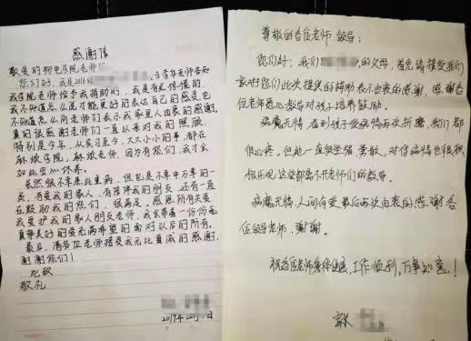 面对大家的关心帮助,张真真和家人十分感动,手写两封感谢信送到学院,他们在信中表达了对学院师生的感谢,并表示“将带着一份真挚美好的爱充满希望的面对以后的所有”。