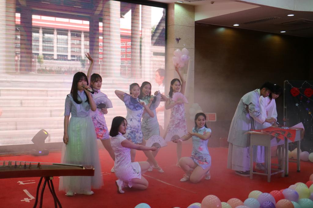 在“不忘初心—共创时代新辉煌”篇章,既有历史话剧小组对《铡美案》进行再创作,使传统戏剧曲目在新时代新形式下大放异彩,突出“人间正道是沧桑”的鲜明主题;又有啦啦操助兴,礼赞新时代。晚会最后,李红艳院长、张延昌书记等老师与全体参演者一同走上舞台,一起高唱《不忘初心》,并合影留念。