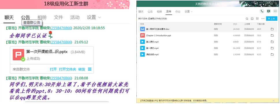 化学与化工学院以教研室、教学团队为单位,多次通过QQ群、微信群、腾讯视频会议等交流平台,分析线上教学面临的问题,科学制定教学计划,合理安排“在线授课”、“线上答疑”、“课后作业”、“学习打卡”等环节,确保2月24日按期、顺利地开展了在线教学活动。