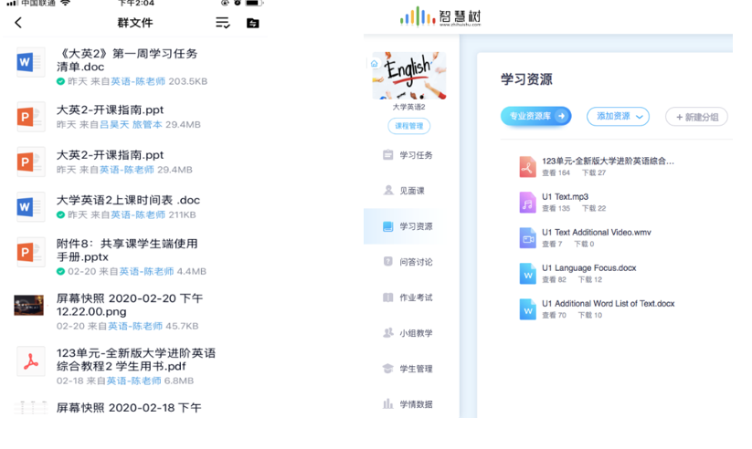 虽相隔千里,但同学们和老师配合十分顺利。开课前一天,外国语学院陈乐老师在QQ群内上传“大学英语2-开课指南”、“上课时间表”及“《大学英语2》第一周学习任务清单”,告知学生线上教学使用的平台及注意事项。对于提前完成学习任务的同学,布置新的学习任务,并及时反馈学习效果。