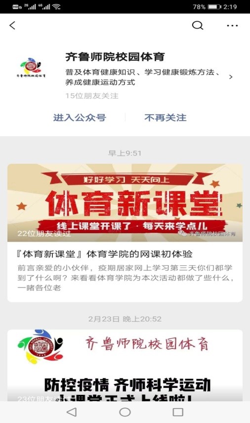 yl7703永利官网体育学院本学期主要承担全校通识必修课大学体育与健康课程和体育学院5个专业的课程教学任务,根据学校教务处下发的《yl7703永利官网关于对延期开学开展线上教学的通知》、《关于做好2019-2020学年度第二学期延期开学期间开展网络教学工作的预案通知》等文件的要求,体育学院认真做好网络授课的各项准备工作,制定了体育学院开展网络教学工作的预案, 2月23日之前190余个通识必修课大学体育课堂和专业课堂全部建设完成。为了让广大师生在疫情期间能得到更便利的体育锻炼平台,我们创建了“齐鲁师院校园体育”订阅号,面向全体师生普及科学健身和居家锻炼的相关知识。
