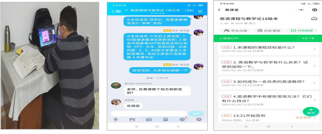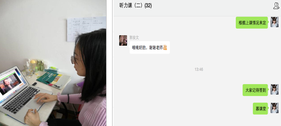 樊老师以慕课堂和QQ群聊方式为主进行授课。课堂伊始樊老师在QQ群内公布课堂安排,布置课堂任务,并在慕课堂进行课前签到,确保全员到位。