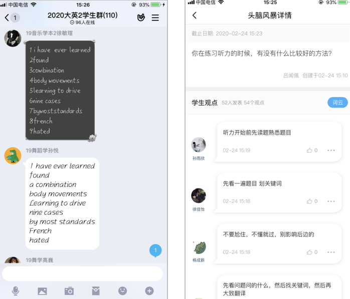 吕闻佩老师利用知到APP,发布上课内容,并利用QQ群同步教学,在语音讲完课程大纲后,开始视听说课程,利用QQ群进行讲解和学生回答问题。在进行完本节课任务后,下课前,老师开启头脑风暴,引导同学们说出自己觉得有效的听力练习方法并进行鼓励,整节课气氛活跃,同学们高效完成听力任务,学习氛围浓厚。