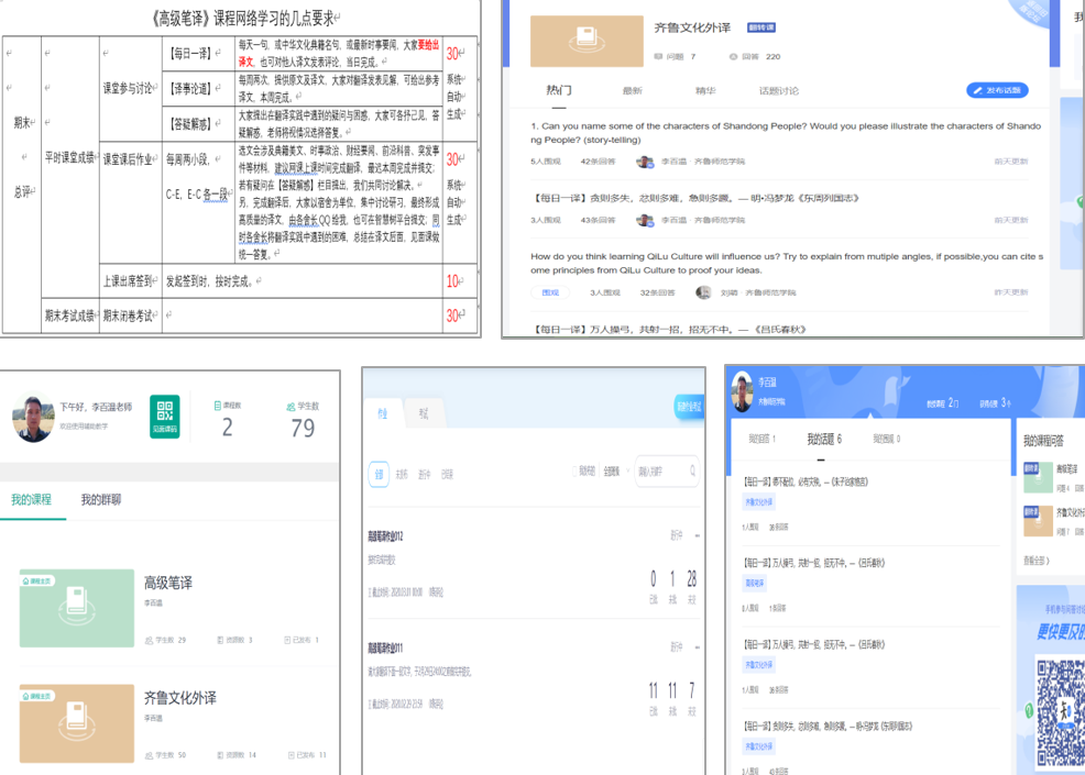 李百温老师本学期讲授两门新开课《齐鲁文化外译》与《高级笔译》。他充分利用智慧树翻转课堂的优势,先制定本学期每周学习计划,在平台发布;将每周学习任务分配给不同学习小组,在老师指导下研究汇报;结合翻译实践性强的学科特点,开发【每日一译】、【译事论道】、【答疑解惑】等栏目,并安排相应学生主持人维护管理;作业提前在平台发布,翻译完毕后分小组讨论,梳理难点与困惑,在答疑解惑栏目发布,老师在平台选择回复解答;见面课利用腾讯会议,统一解答翻译实践中突出的问题,讲评译文,提高下次作业译文质量。