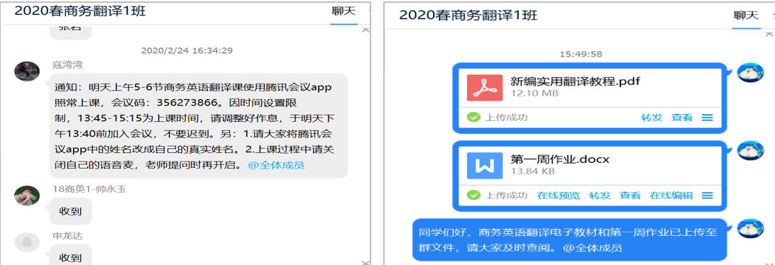 汪洁老师以《新编实用翻译教程》为主进行教学。她在课前提前下发电子版教材和有关线上教学的通知,让同学们提前熟悉上课流程,为顺利展开教学工作打好基础。