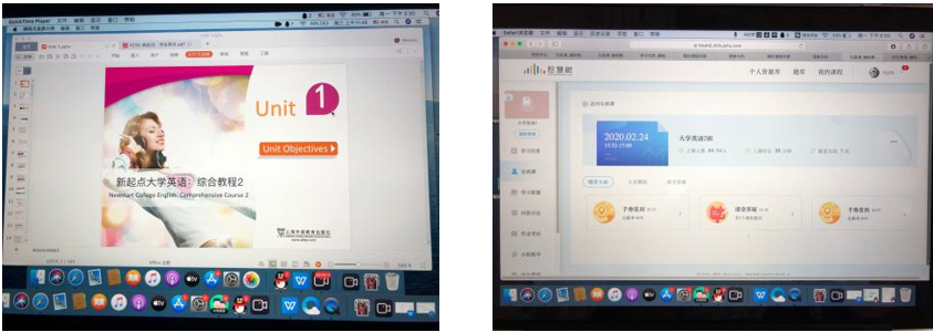 除此之外,为学生基本知识的巩固,她带领同学们观看智慧树上的学习视频,并分享学习资源,讲解连读技巧。