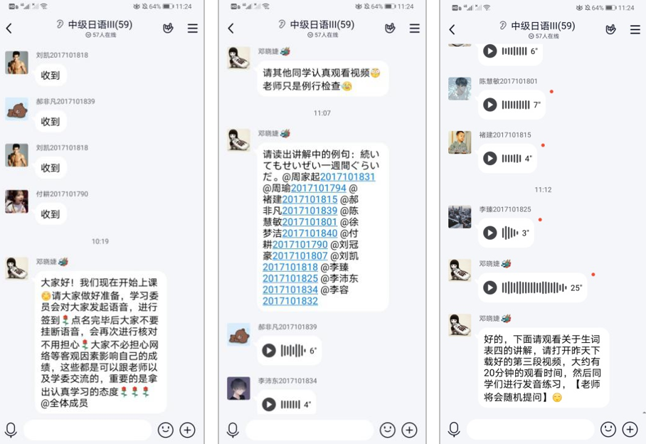 张老师在群中及时答疑,带领大家理解生词,同时进行课堂讲解,课后她要求学生拍照提交作业,并根据作业情况进行语音讲解。