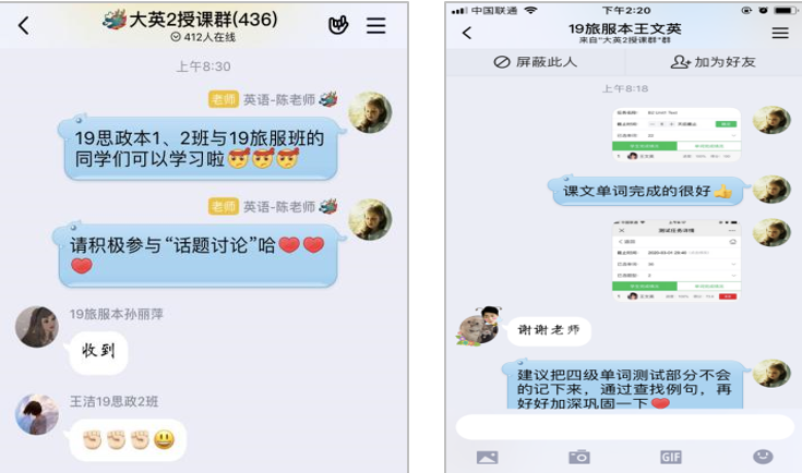在上课期间对学生发布学习任务,让学生在QQ群内讨论,完成相应的课程任务,随后要求学生在学校安排的学习平台完成课堂小测,以巩固本节课所学的知识。学生完成后董老师在线批改,并将出现的问题挑出来与同学们共同深入探讨。