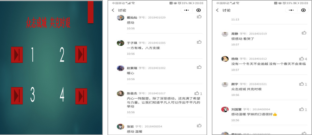 石磊老师寓教于乐,不仅从中带领学生学习新冠肺炎的相关英语表达,获取知识,还与学生分享世界卫生组织总干事谭德赛的三句话:This is the time for facts, not fear. This is the time for science, not rumors. This is the time for solidarity, not stigma.引导学生相信事实,相信科学,团结一致共克时艰。通过慕课堂教学平台与学生展开积极互动,共同探讨了“加油”一词的英文翻译,激发了同学们的爱国热情,对奋斗在抗击疫情第一线的英雄们表达了崇高的敬意,树立了必胜的信心,同学们自己也自我反思,明确表示自己会在自己力所能及的范围内为国家做贡献:捐财捐物,做志愿者,不传谣不信谣等等,达到良好的教学效果。