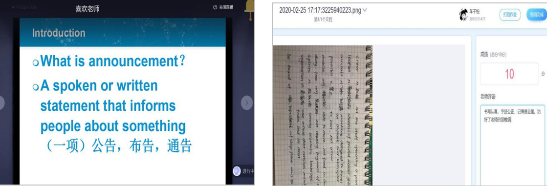 黄迎老师课前认真备课,精心设计教学课程,在线为学生详细解读,提高了同学们课堂学习的参与度和积极性。同时为同学们的任务进行网络批阅和修改。