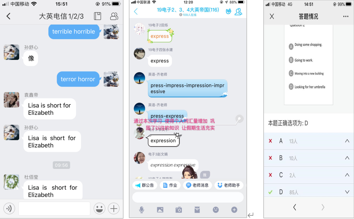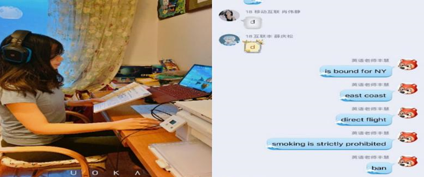 在课堂教学中,汪洁老师采用在线直播的方式与同学们实时交流,为同学们讲解重要知识点,并采用在线聊天的方式向同学们提问,通过对专有名词的翻译提问进一步开展教学,加深了学生的记忆,增强了学生的课堂知识获得感。