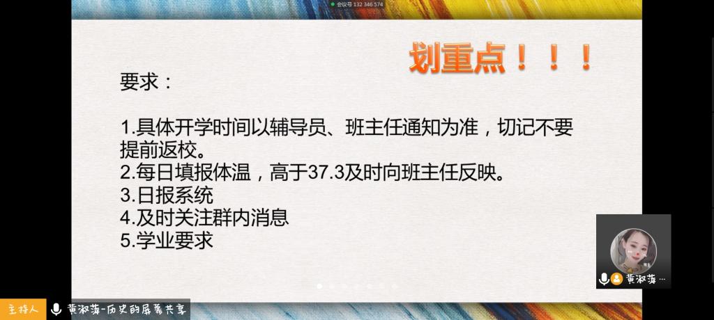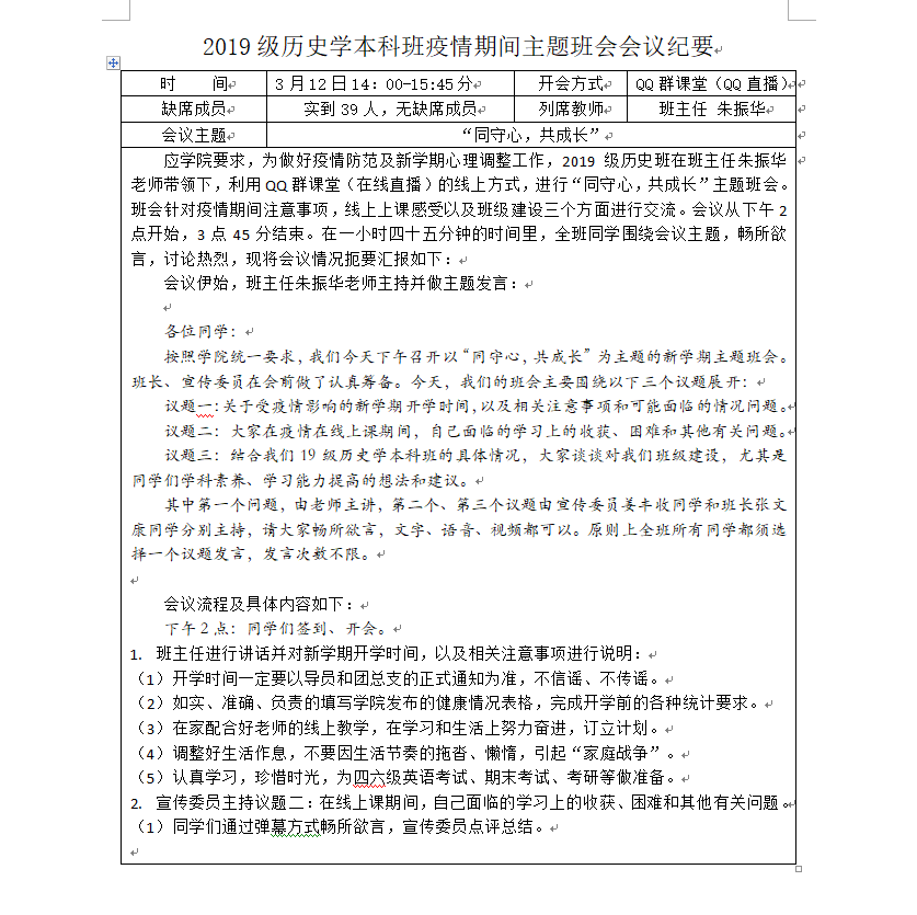 为确保高质量开好本次线上主题班会,历史与社会发展学院高度重视,会前统一向班主任传达学校疫情防控相关文件精神,要求班主任加强对班级同学的人文关怀和价值引领。与此同时,班主任提前制作主题班会课件,收集学生关注度的问题,并教育引导学生既要注意个人防护,又要及时完成学业任务,把思想政治教育、生命健康教育、专业知识学习教育贯穿班会始终。