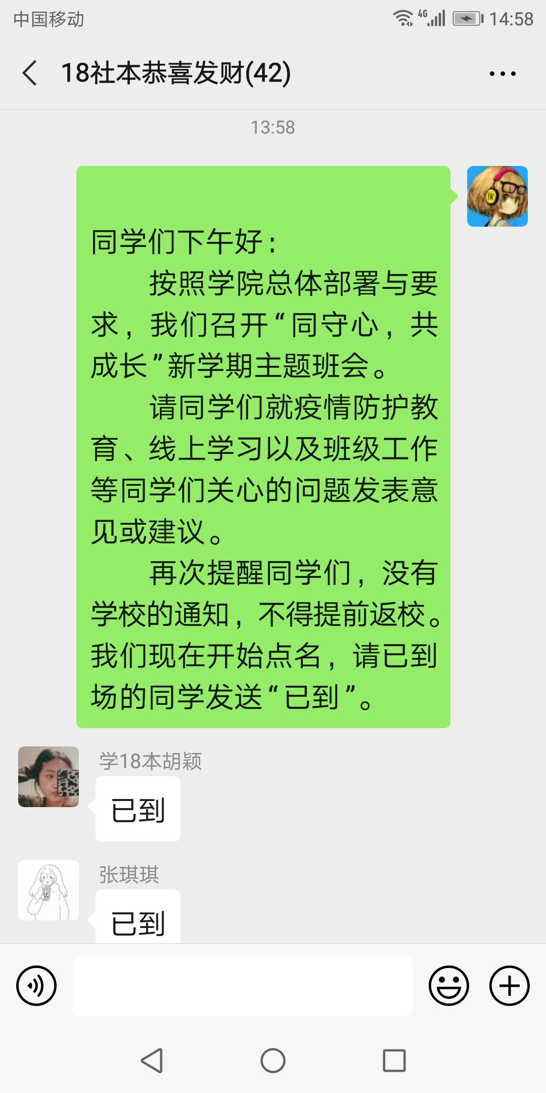 肩上扛着立德树人的根本任务,心里想着教书育人的初心使命。疫情防控仍是当前一段时期学习生活的头等大事。主题班会上,班主任首先围绕疫情防护与同学们交流,强调同学们要确保自身身体健康和生命安全,注意个人卫生,同时做到不信谣、不传谣、不造谣,在家静候辅导员和班主任开学通知。其次,确保线上教学提质增效是当前学校工作的重点,班主任与同学们交流线上教学成效及存在问题,成效主要是线上学习可以通过QQ群实时与老师交流,不受地域、时间限制,做到全方位、全时空学习,随时回放,便于重复学习和复习;问题主要集中在线上学习平台系统有时不能正常登录、个别课程线上老师讲述语速过快,个别课程课下作业偏少等,针对这些问题,班主任老师提醒同学们课前应早预习,课上认真听老师讲解,课下多与任课教师和同学交流探讨。第三,深化班级管理和教育是班主任工作的重点。班主任老师就上学期班级日常工作进行总结,与同学们探讨疫情形势下班级管理工作的不足,同学们大都结合自己实际提出了合理化建议。此外,班主任老师并就新学期学习任务和班级管理提出了具体要求,给同学们指明了努力方向。