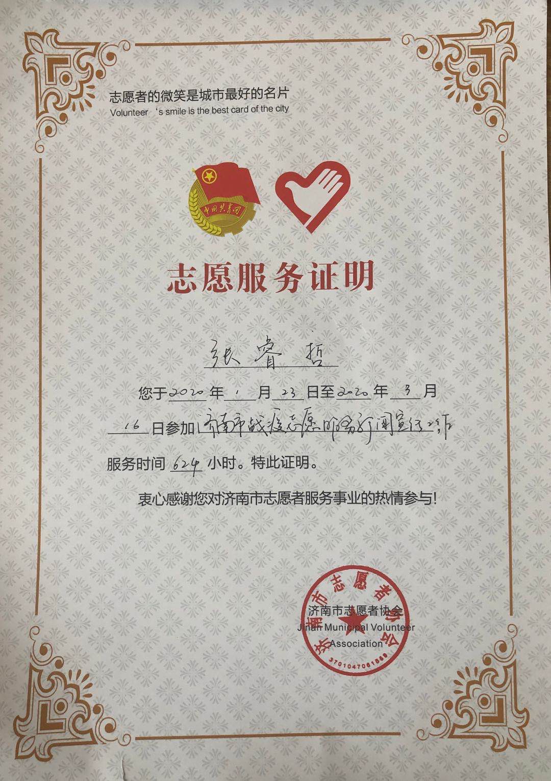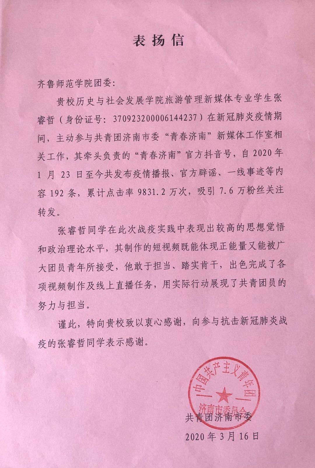 近日,校团委收到了一封来自共青团济南市委的表扬信,以表扬永利官网张睿哲同学在参与抗击新冠肺炎疫情工作的艰辛付出,肯定学校为党育人、为国育才的办学成效,是广大青年团员学习的榜样。