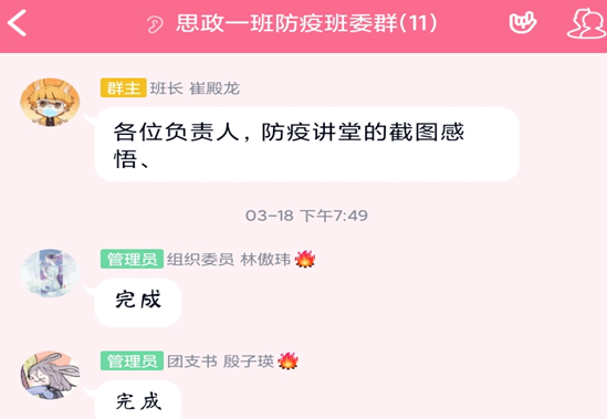 为切实保障每位学生的身体健康,引导学生科学认识新型冠状病毒、科学理性对待疫情,提高学生们的健康素养,学院在班级内部实行“班委负责制”。“班委负责制”的实施,既起到了督促学生们认真学习,将疫情防控知识“入耳、入脑、入心”的作用,同时又锻炼了班干部的组织能力、领导能力和协作能力。