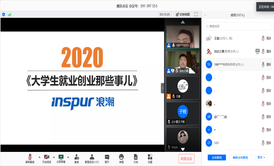 ICT基地组织浪潮科创中心校园专题讲座5月28日,为了在疫情期间加强对同学们的职业素质培养,提升对就业、创业及行业企业等方面的深入认识,齐鲁师范ICT产教融合创新基地项目经理邓勇特邀请浪潮集团资产运营部副总经理刘志勇先生为同学们进行《浪潮科创中心就业创业校园行》的线上主题讲座。 讲座通过腾讯会议的方式进行,基地校企合作专业三个年级共200多名学生参加了此次讲座。