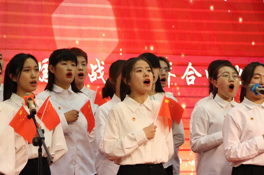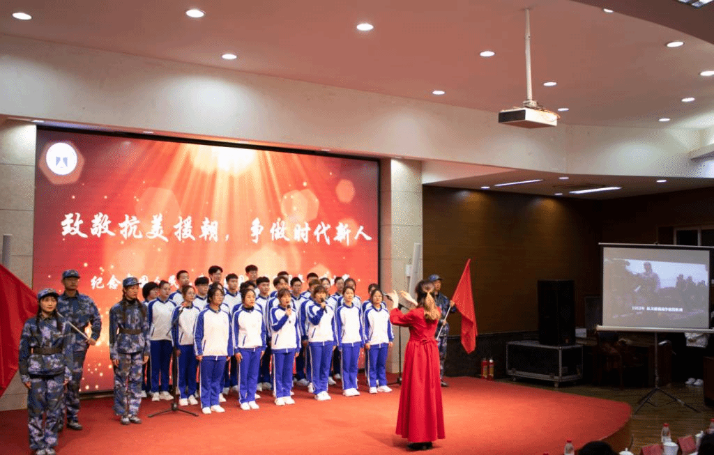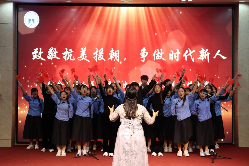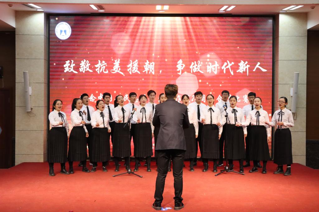 “一条大河波浪宽,风吹稻花香两岸……”最后,全体老师同学起立,用最炙热的情感合唱《我的祖国》,在流淌的旋律中倾诉着与祖国母亲的温情,感受着作为中华儿女的自豪,向伟大的中国人民志愿军英雄献歌。