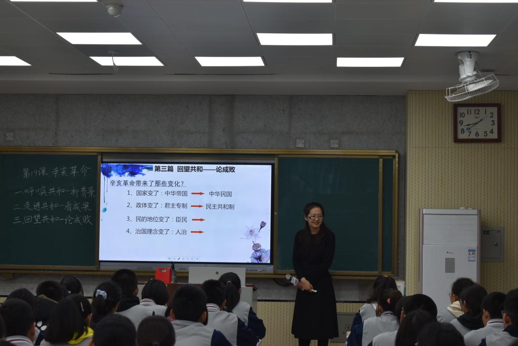 活动开始前,章丘四中历史教研组组长程莲老师对我院师生的到来表示热烈欢迎,肯定了同学们谦虚好学、认真踏实的学习态度,并对本次活动的流程做了简要的介绍。随后,同学们分别观摩了高一历史组秦莹莹老师的《辛亥革命》以及高二历史组郭春梅老师《工业革命与工厂制度》的授课。观摩的过程中,同学们认真记录授课教师的教学环节与学生活动,结合统编版教材的内容,细致观察并学习教师在处理教材过程中采用的方法和手段。秦莹莹老师的《辛亥革命》一课,通过“呼唤共和——析背景”、“走进共和——看成果”、“回望共和——论成败”三部分建构教学体系,充分运用现代教育技术手段,展示了内容丰富、形式多样的史料,启发学生思考“辛亥革命带来的精神财富”,于细微处处升华教学,令人回味无穷。郭春梅老师的《工业革命与工厂制度》一课,运用谈话法,将知识点整合成问答题,借助结构图、表格等多种形式,充分调动学生学习的积极性,使各教学环节环环相扣、高潮迭起。同学们在观摩的过程中,近距离感受到了教学现场的生命力,对历史教师如何挖掘教材、运用多媒体、组织课堂等问题有了更为直观形象的认识,有利于同学们历史教学知识的积累和技能的提升。