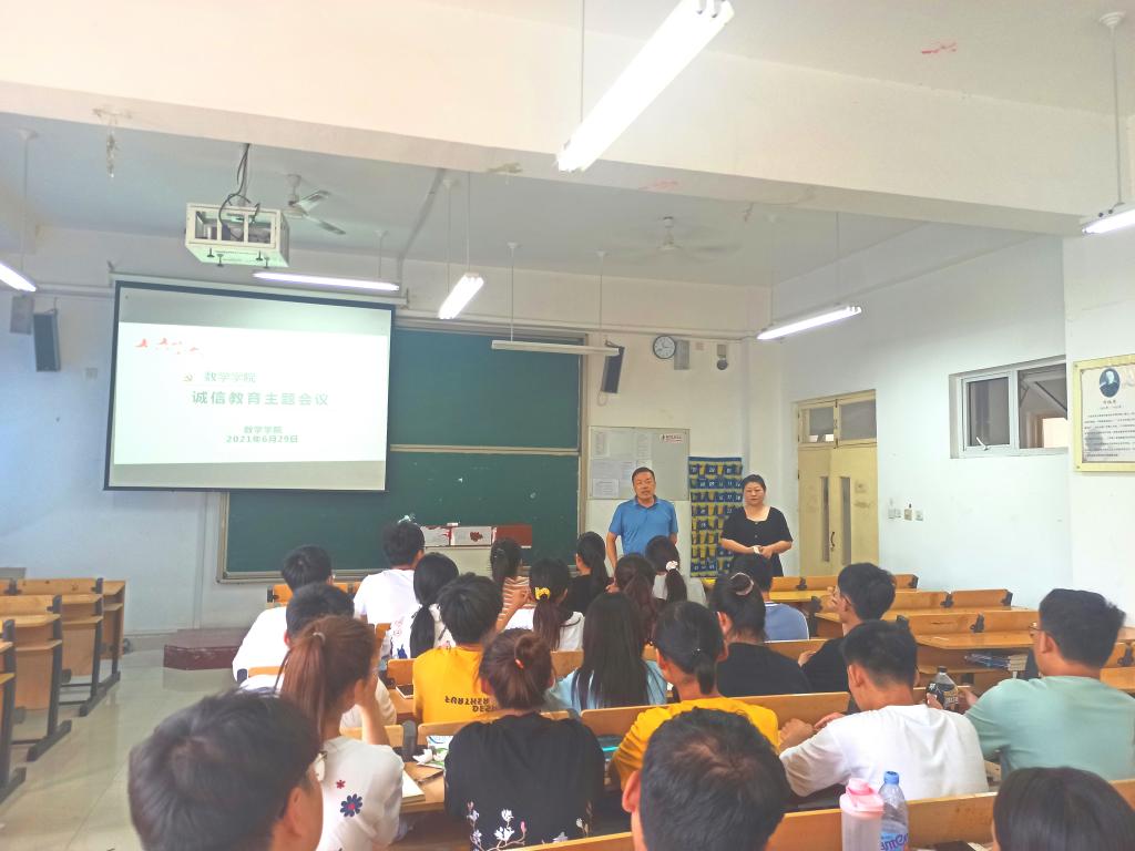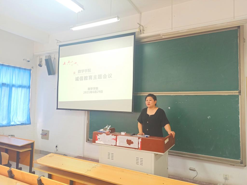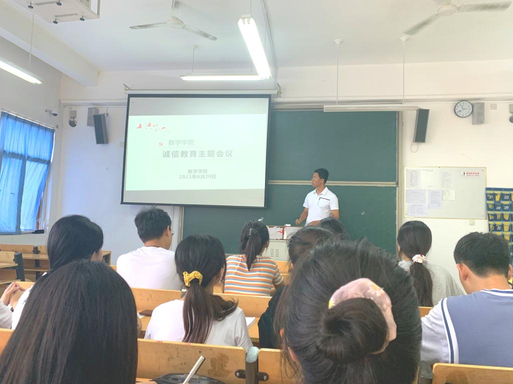 为进一步倡导诚实守信的良好学风风尚,增强学生诚信考试意识,6月29日下午,数学学院在二号教学楼A412教室召开诚信教育主题会议。数学学院党总支书记孔志学、党总支副书记初益辰出席本次会议并讲话,各班主要班委参加会议。团总支副书记孟凡湘主持会议。