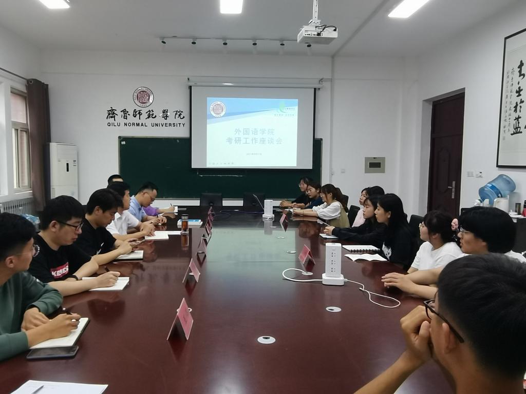 为深入贯彻习近平总书记高质量发展理念,响应学校“质量立校、人才强校、特色名校、文化铸校、服务兴校”发展战略,推进外国语学院学生高质量发展,外国语学院于2021年8月31日下午在会议室召开考研工作座谈会。党总支书记贾国斌,团总支书记牛荦,教师姬中龙、齐龙飞、魏忠堂,辅导员王伟、刘欣欣以及13位考研学生代表参加本次会议。