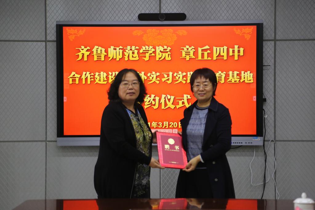 首先,章丘四中党委书记、校长刘清涛同志为双方能够达成合作育人表示衷心的感谢和美好的祝愿,他详细介绍了章丘四中的办学历史和当前学校发展情况,并希望今后双方能在中学教育见习、教育实习、教师专业成长、教学研究等方面展开深入合作,不断促进双方人才培养和教育教学水平的提升。随后,历史与社会发展学院院长李红艳教授介绍了学校及学院的发展情况,她为双方能达成合作关系表示衷心感谢,并就永利官网历史学师范生人才培养方案、我们的办学特色与亮点和与会人员进行了交流沟通,学院聘请程莲老师为我院历史学专业学生的校外实习指导教师。最后,双方在合作建设校外实习实践教育基地协议书上签字,历史与社会发展学院院长李红艳教授向章丘四中党委书记、校长刘清涛同志授予“yl7703永利官网教学实践基地”牌匾,双方完成了揭牌仪式。