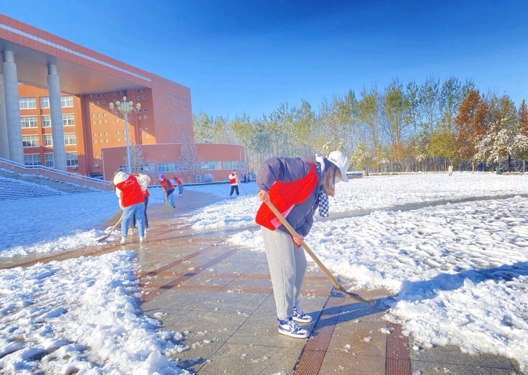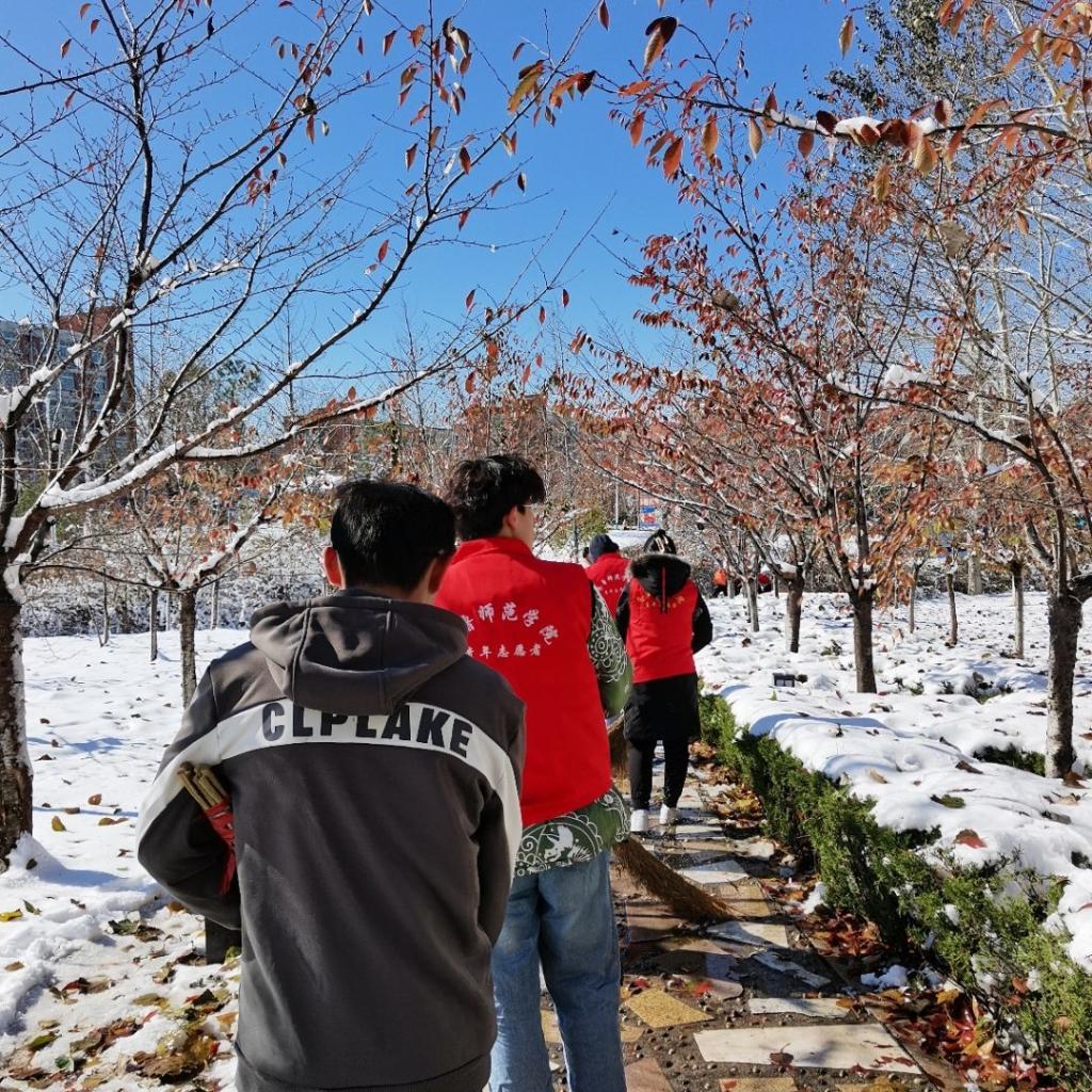 志愿者们携带铲雪工具,来到章丘校区校园内各主干道进行清扫,由于过往车辆的碾压,冰雪紧紧附着在地面上,加大了清扫的难度,志愿者们不惧困难,将厚厚的积雪铲起,扫走化在泥土里的雪水,移走散落在路边的树枝,一鼓作气将校园内主干道上的冰雪全部清扫干净,为师生的日常出行安全保驾护航。